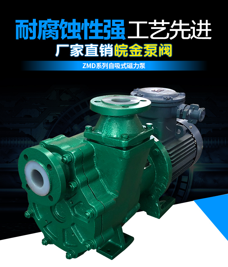 氟塑料磁力自吸泵又稱其為氟塑料自吸磁力泵、襯氟磁力自吸泵、耐腐蝕自吸化工泵,ZMD襯氟磁力自吸泵具有磁力泵和自吸泵的特性,同時兼具良好的自吸功能。按照國標設計研發可以輸送低位介質、罐車原料裝卸、氣液混合介質。過流部件緊襯氟塑料,泵體為金屬材料,能夠承受管道重量。取消軸封,利用磁力間耦合驅動,不會滴漏現象,保障工況安全生產。